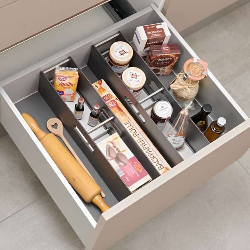 Ampliar FlexBox, organizador extraíble y flexible para caceroleros, compatible con todos los sistemas de cajón del mercado. Disponible en 100 mm y 200 mm de ancho.