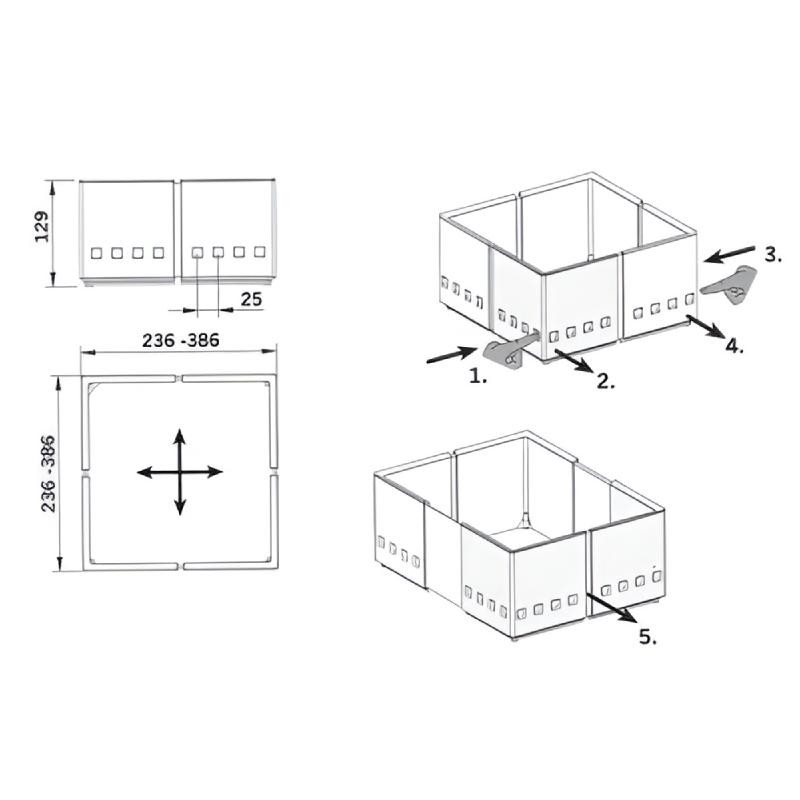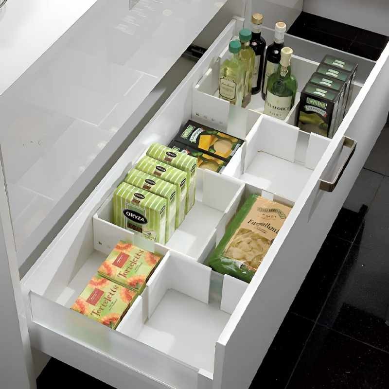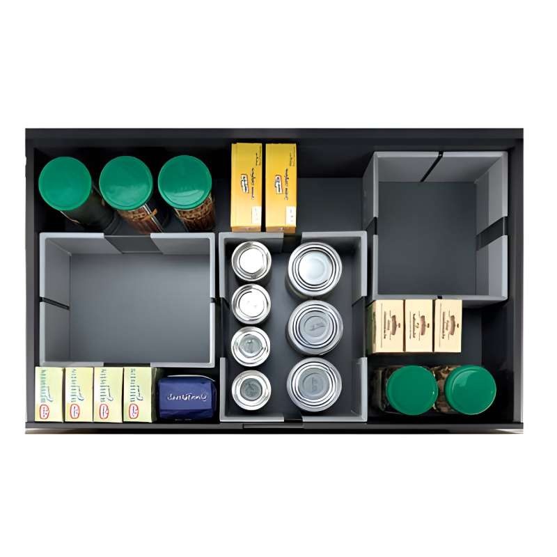 El sistema Fusión Flex está formado por un marco telescópico ajustable que, combinado con otros dentro del cacerolero, permite organizar el espacio de forma sencilla, eficaz y totalmente personalizada. Su diseño adaptable facilita aprovechar al máximo el interior del cajón, creando compartimentos a medida según las necesidades de almacenaje.