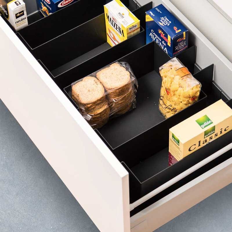 El set incluye 2 perfiles, 3 divisiones metálicas y 1 tapete antideslizante negro recortable de 600 mm. Al realizar el pedido es necesario indicar el modelo de cajón y la medida del costado del mueble (16 mm o 19 mm).