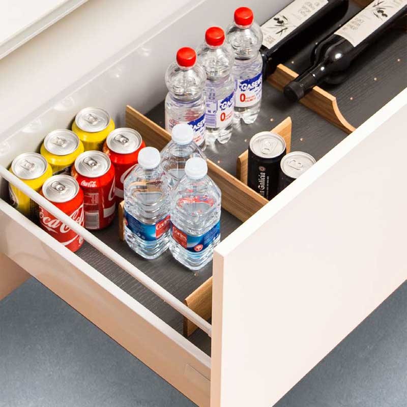Ampliar Mix Set 7, sistema interior para caceroleros de 1200 mm. Componentes en roble y fondo perforado antracita, incorpora divisores y un botellero.