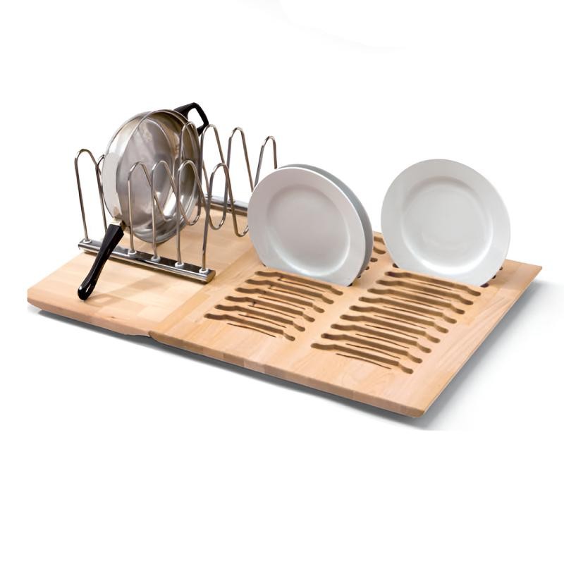 Ampliar Set tablero marino en haya con portaplatos y portasartenes para interior cacerolero de 900 mm, perfecto para ordenar tus platos y sartenes de manera más eficiente. Indicar modelo de cajón y medida de costado de mueble (16 mm o 19 mm) al hacer su pedido.