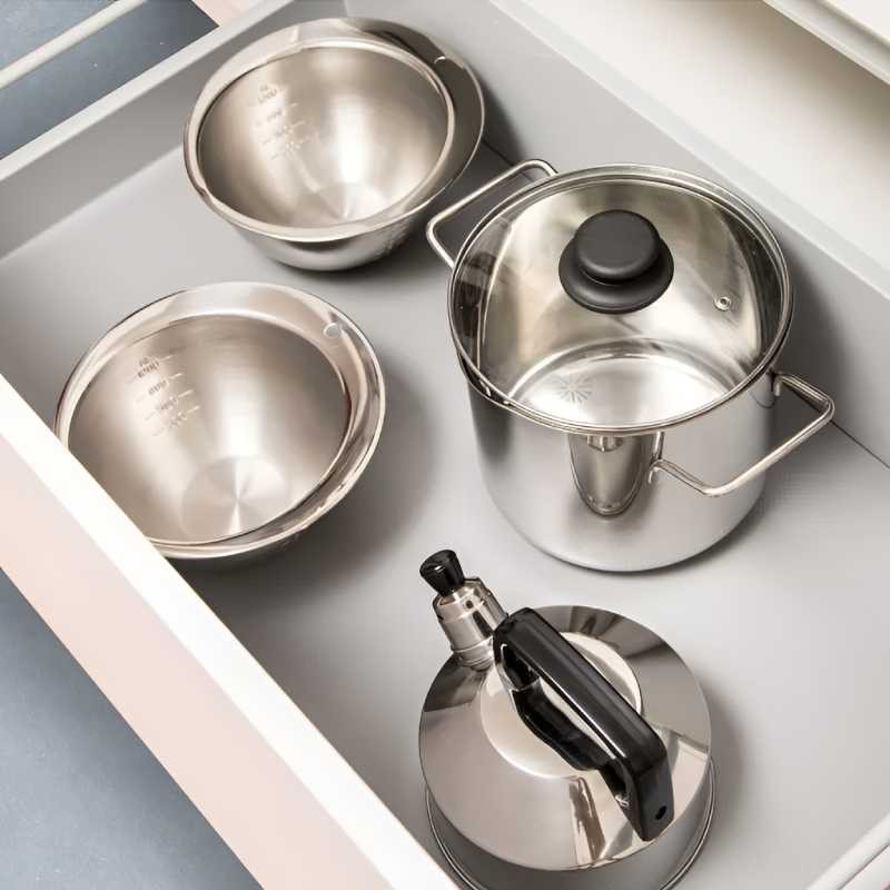 El tapete antideslizante R2 aporta ventajas adicionales a cajones y estantes, mejorando la protección y el orden interior. Su superficie con efecto de freno evita el desplazamiento de los utensilios de cocina y otros objetos, manteniéndolos siempre en su sitio.