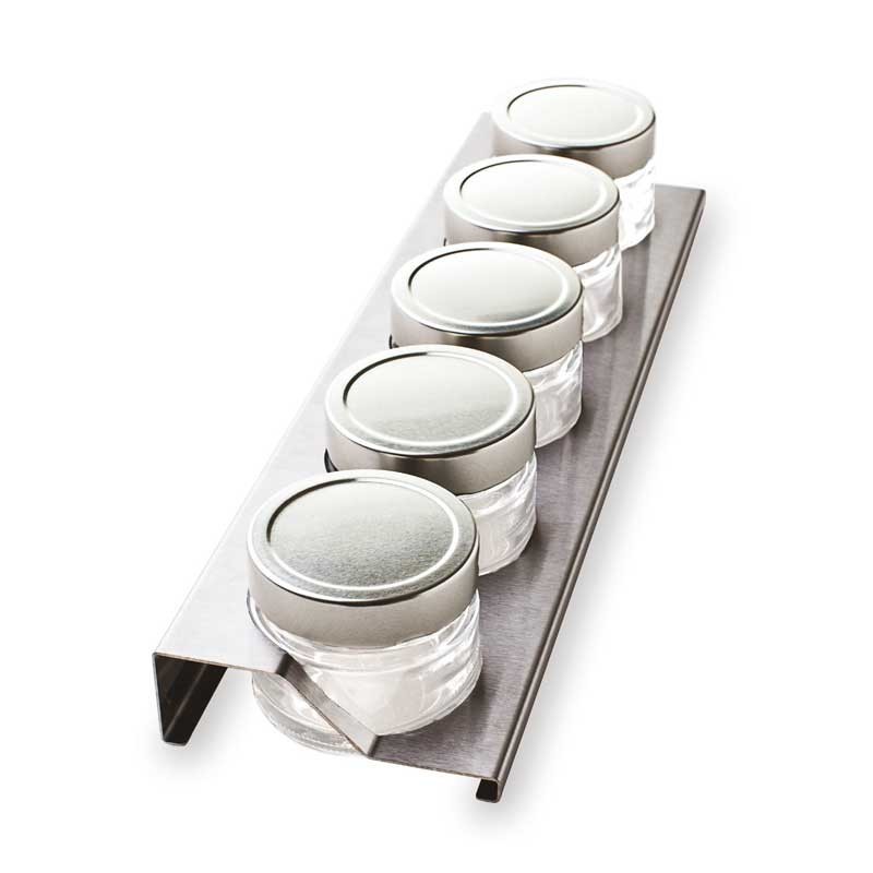 Ampliar Portaespecias de acero inoxidable con 5 especieros de cristal para cubertero de cocina modelo Premiere.