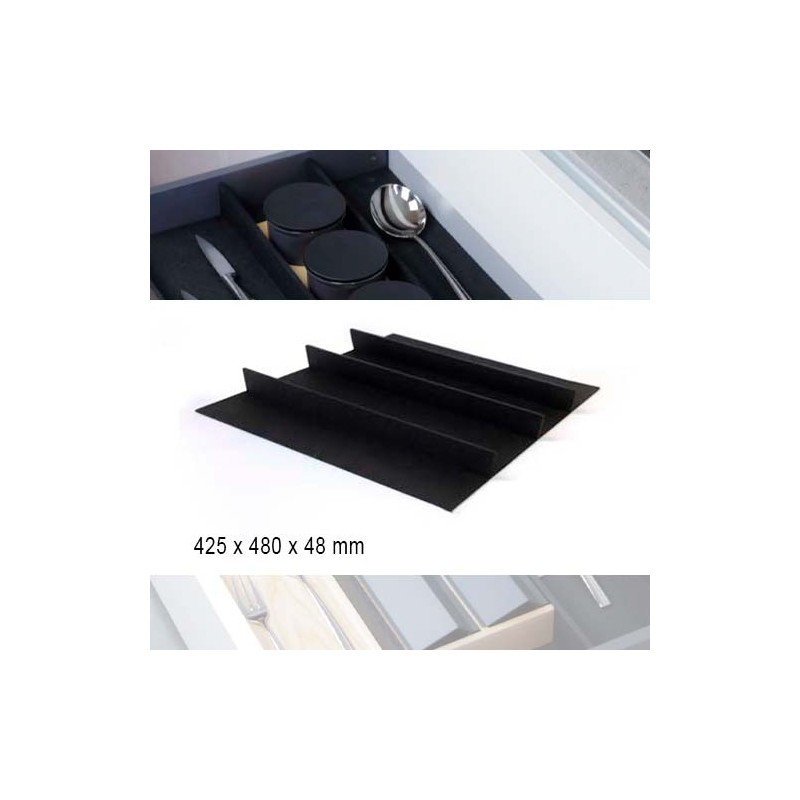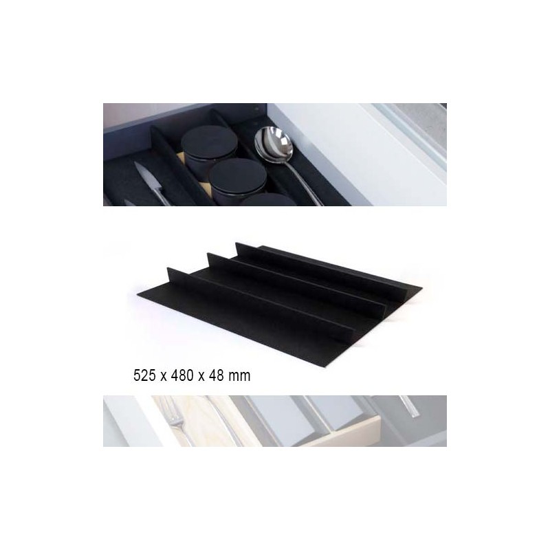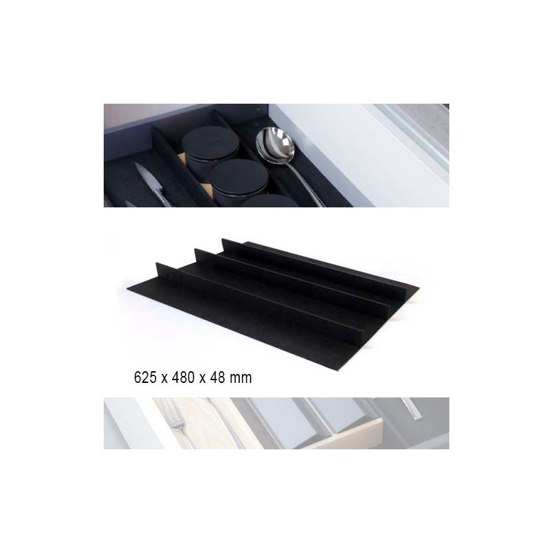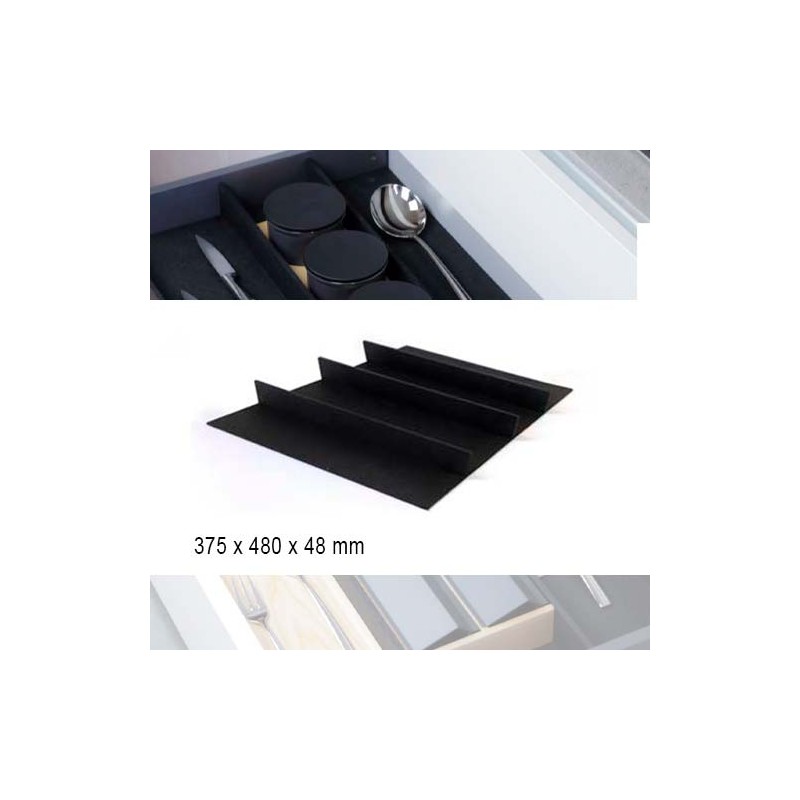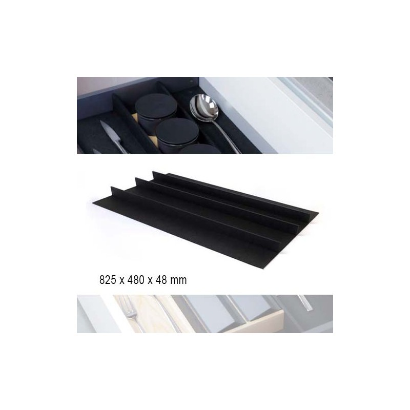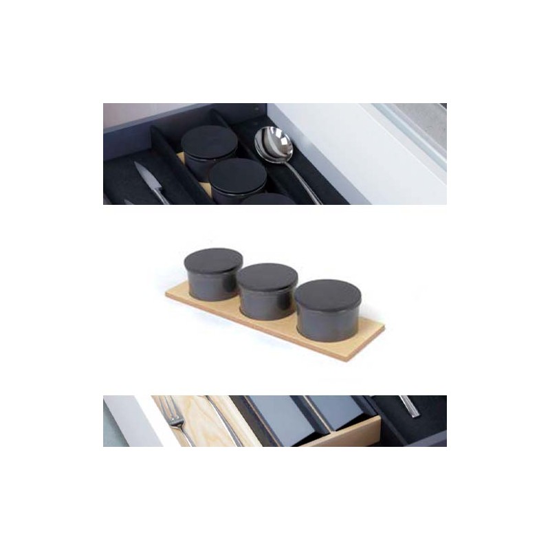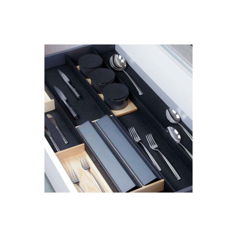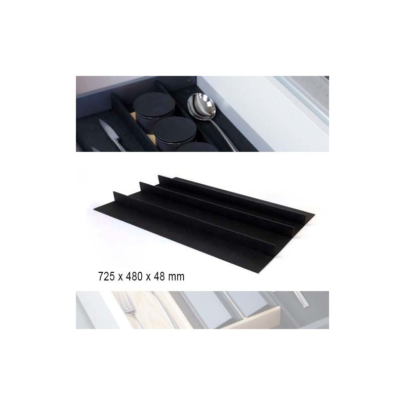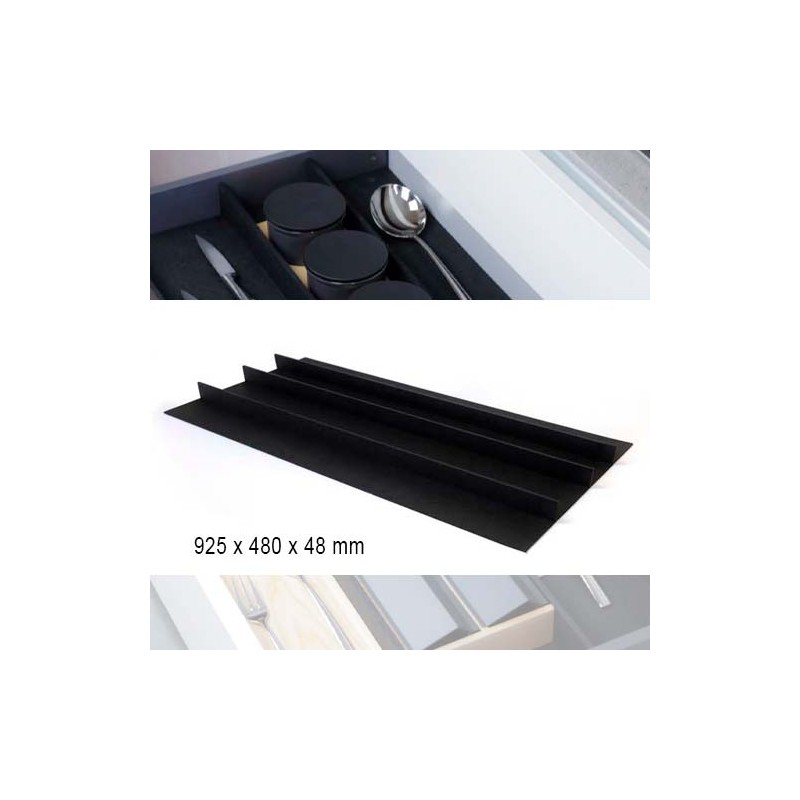 La familia consta de los propios cuberteros con divisiones horizontales de una sola pieza, en OrganiQ (material reciclado), y pintados en negro.