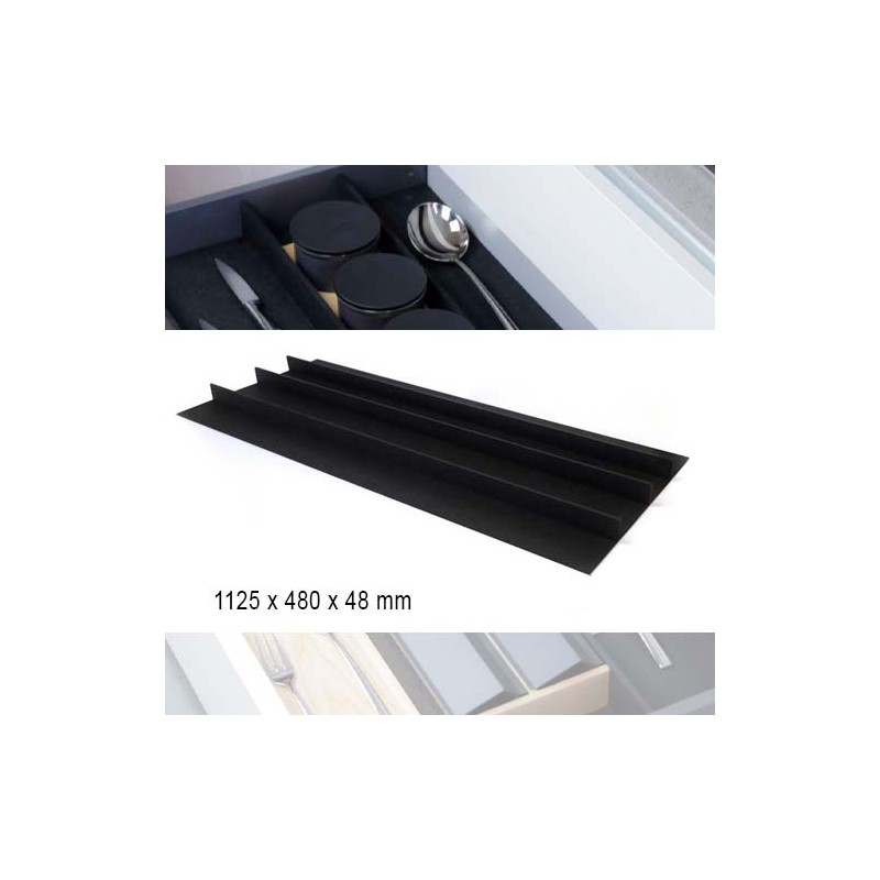 Ampliar Cuberteros con divisiones horizontales de una sola pieza, fabricados con material reciclado OrganiQ, y pintados en negro.