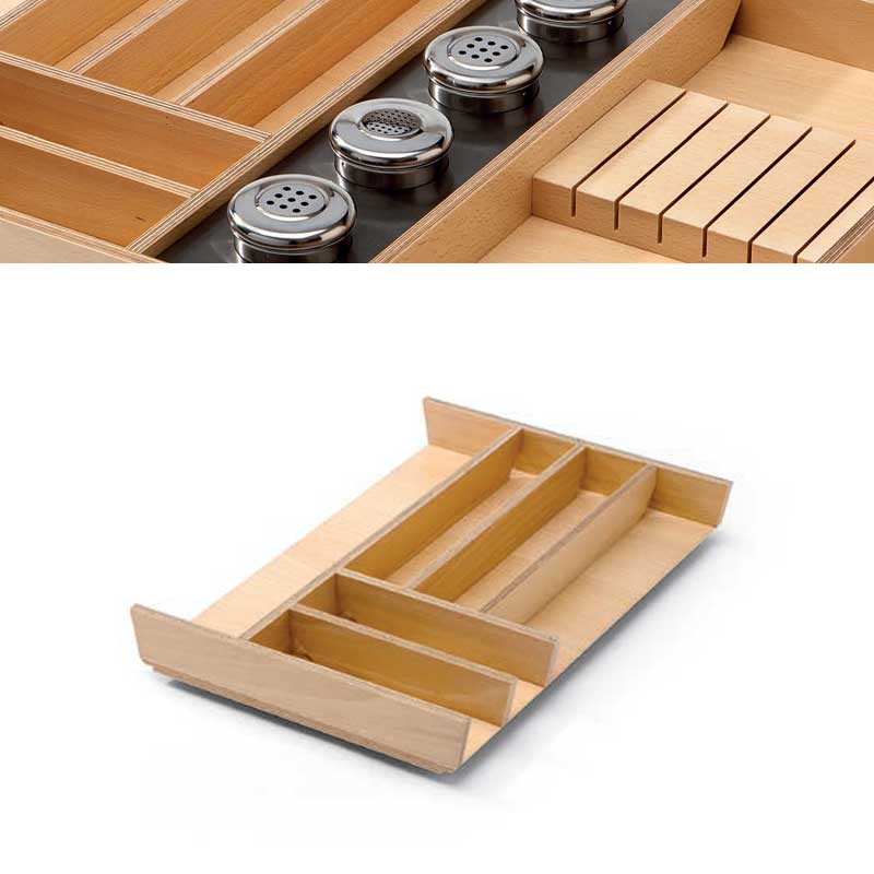 Ampliar Cubertero clásicos y atemporales hechos en tablero fenólico chapado en haya sin lateral queda completamente integrado al cajón de 400 mm.