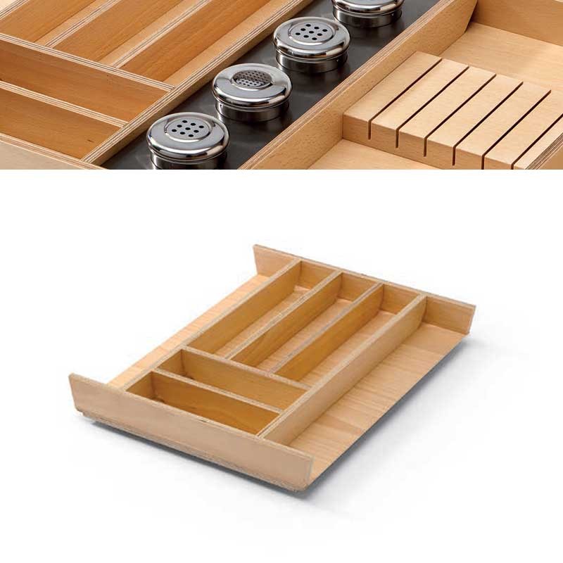 Ampliar Cubertero clásicos y atemporales hechos en tablero fenólico chapado en haya sin lateral queda completamente integrado al cajón de 450 mm.