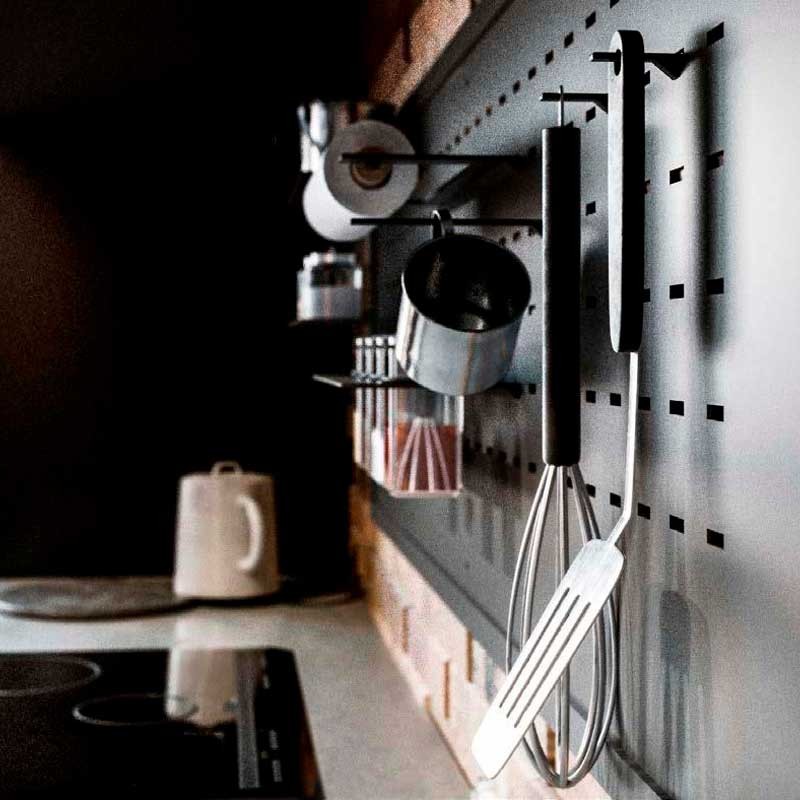 Ampliar Linero Back es una placa metálica delgada, versátil y modular para instalar en cualquier pared. El perforado de la superficie, permite crear combinaciones infinitas.