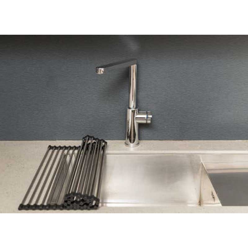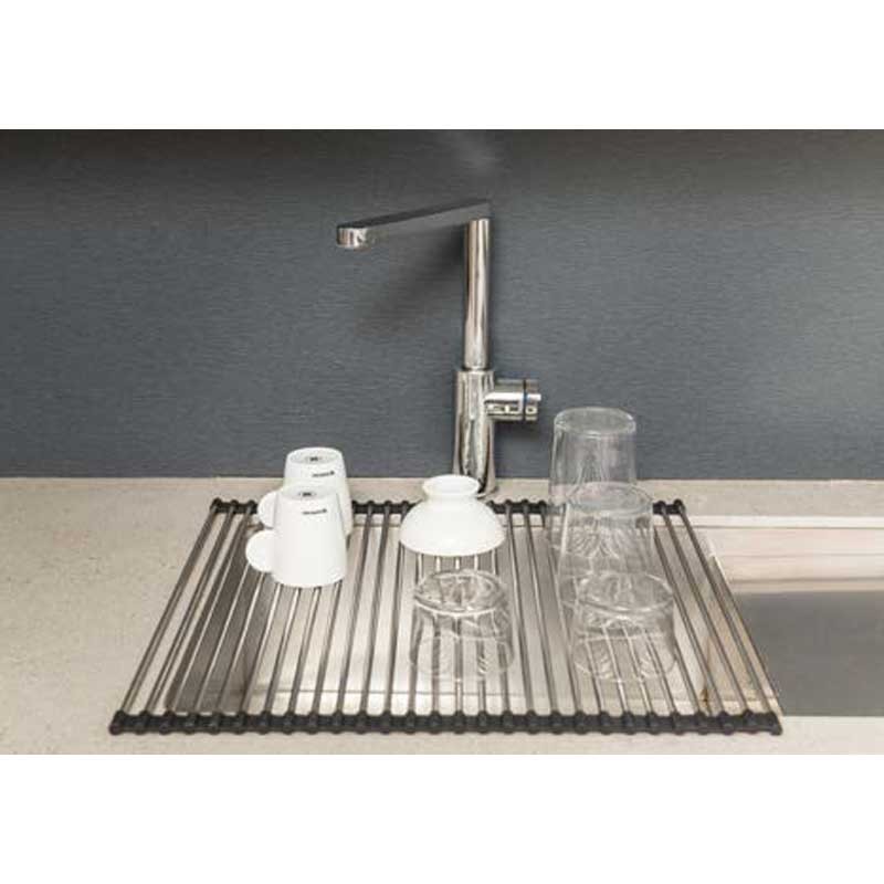 Accesorio escurridor para fregadero enrollable de acero inoxidable y goma de silicona negra.