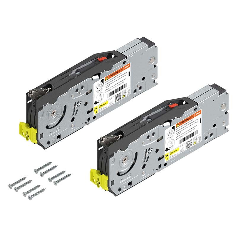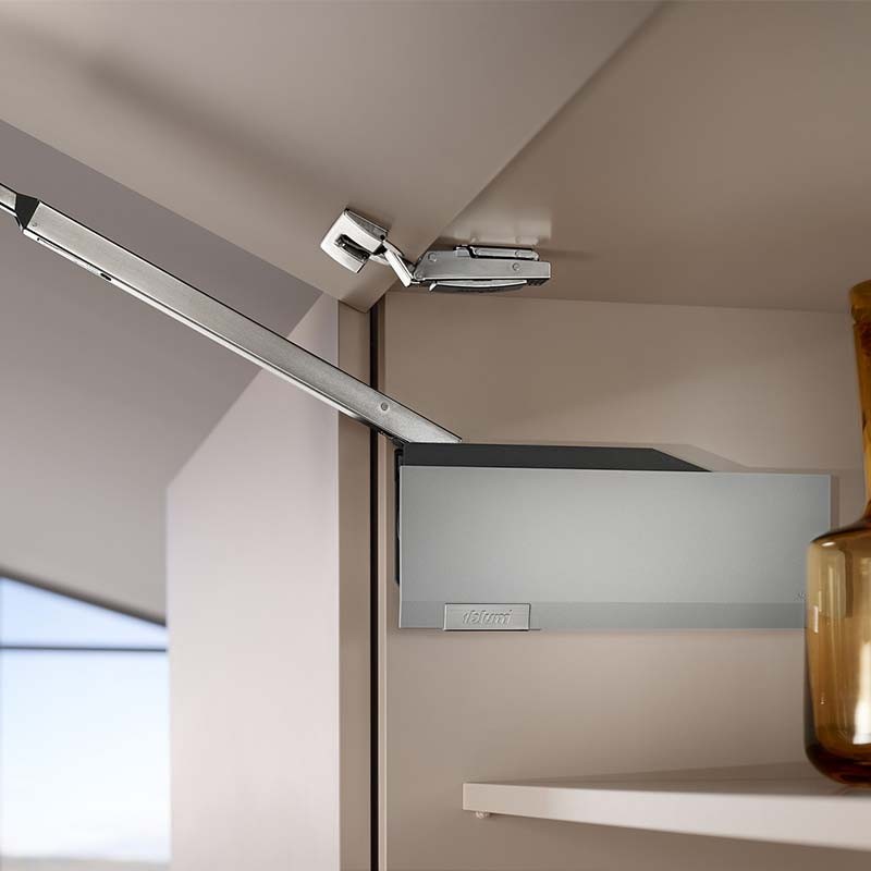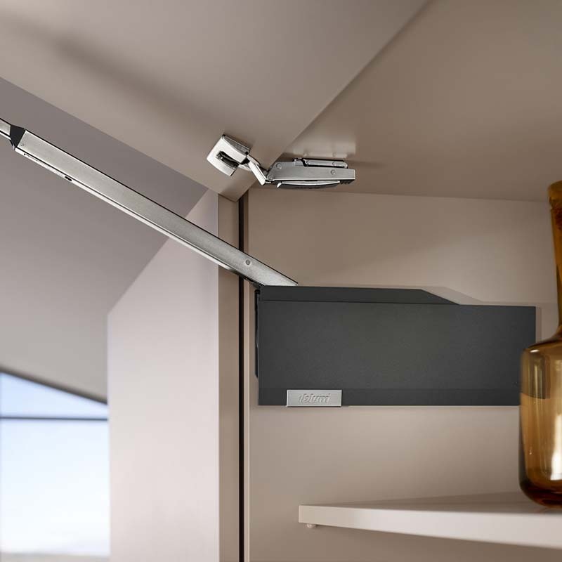 Con las bisagras abatibles de cocina AVENTOS HF Top el frente de dos hojas se pliega por el centro al abrirse, resultando especialmente apto para armarios grandes y altos.