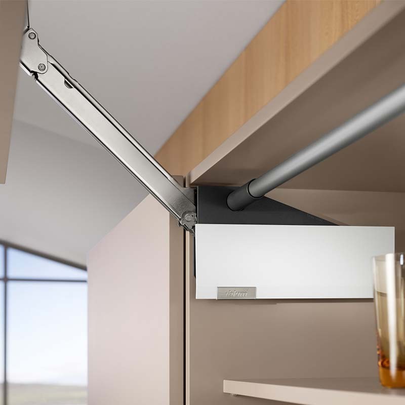Con las bisagras abatibles de cocina AVENTOS HL Top el frente de una sola hoja se eleva en paralelo al mueble al abrirse, resultando especialmente apto para armarios colgantes.