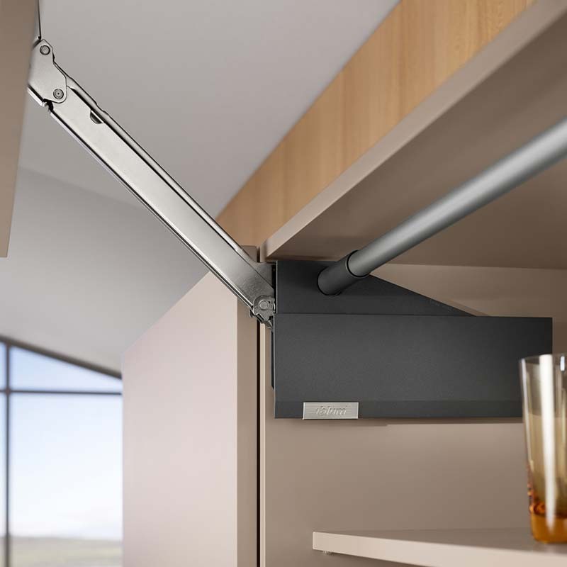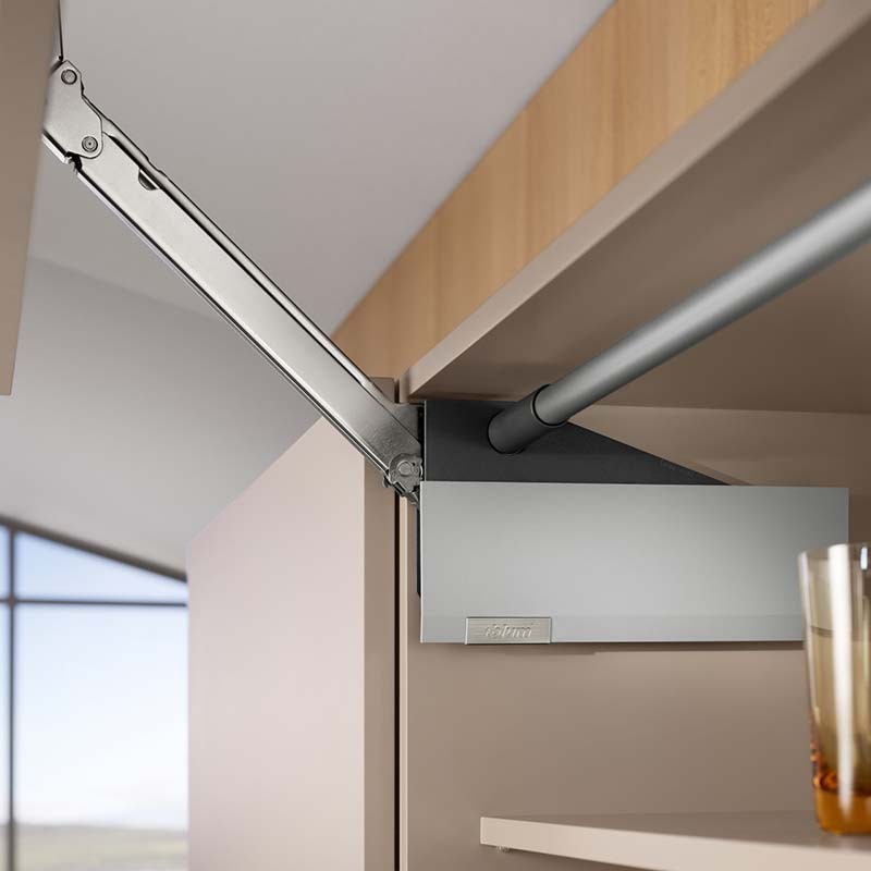 Ampliar Con las bisagras AVENTOS HL Top el frente de una sola hoja se eleva en paralelo al mueble al abrirse, resultando especialmente apto para armarios colgantes.
