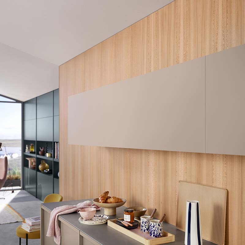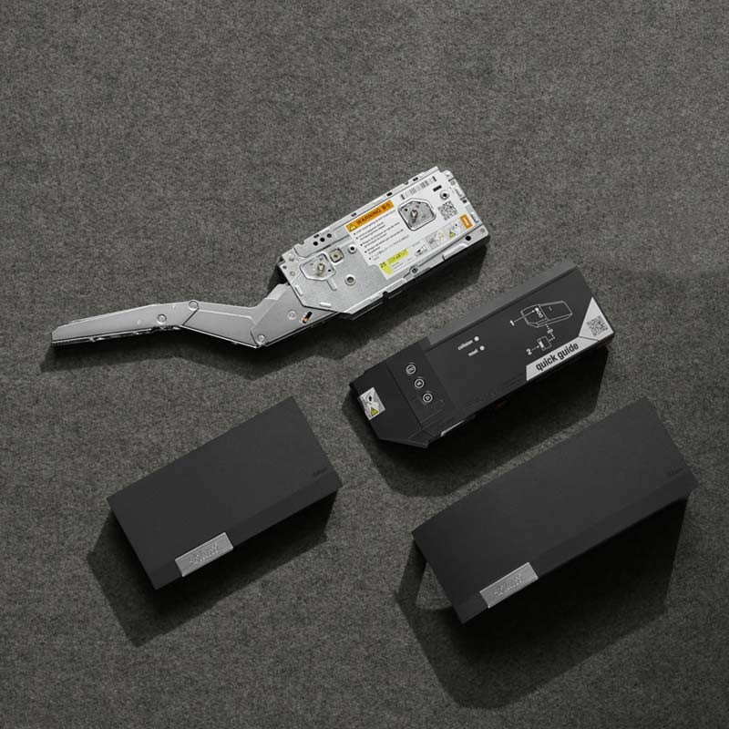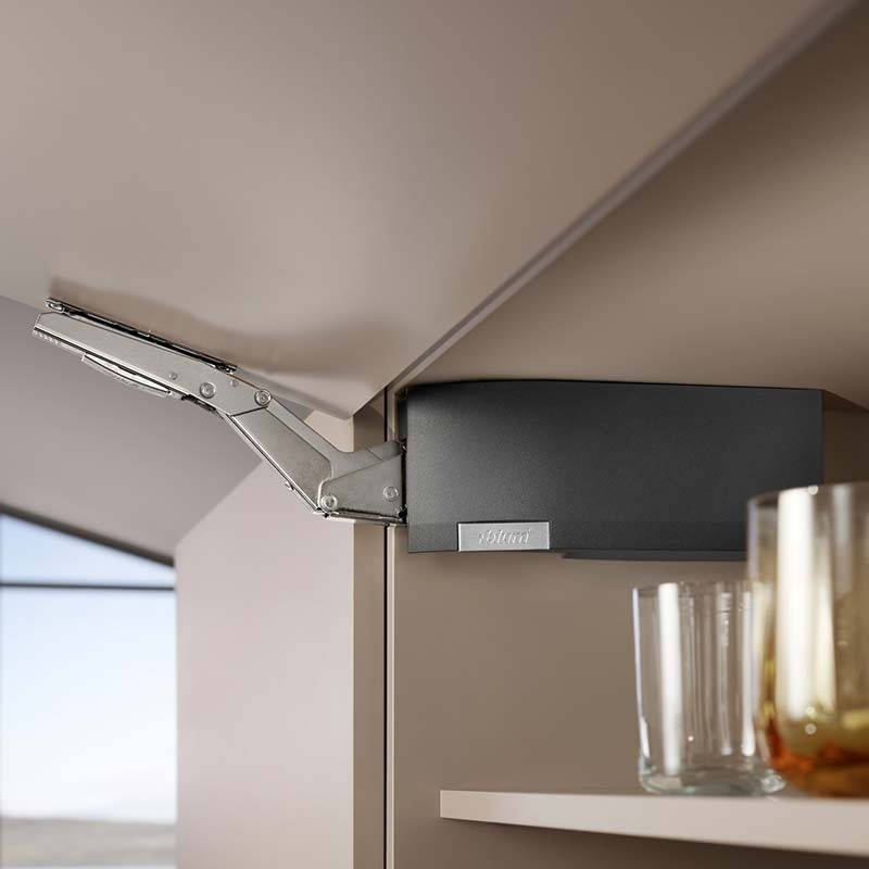 Gracias a su motor incorporado basta una ligera presión sobre el frente del mueble para que la puerta abatible se abra. Incluso los frentes más grandes y pesados se levantarán como si no existiera la gravedad. El compás abatible se eleva por encima del área de movimiento y el usuario de la cocina obtiene un excelente alcance al interior del armario.