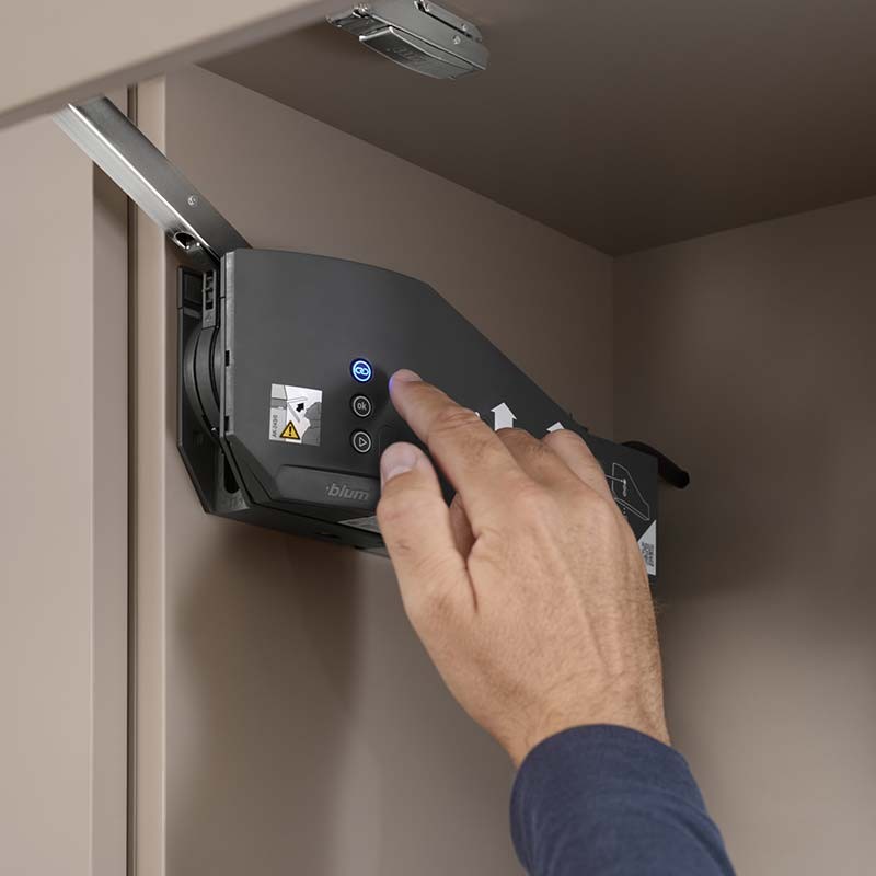 Gracias a su motor incorporado basta una ligera presión sobre el frente del mueble para que la puerta abatible se abra. Incluso los frentes más grandes y pesados se levantarán como si no existiera la gravedad. El compás abatible se eleva por encima del área de movimiento y el usuario de la cocina obtiene un excelente alcance al interior del armario.