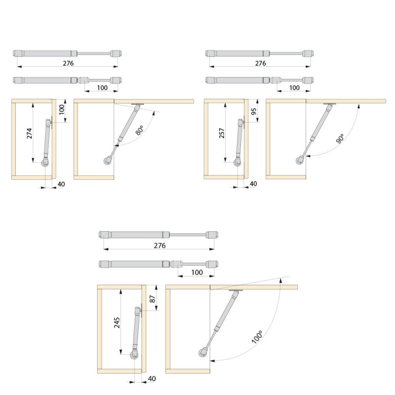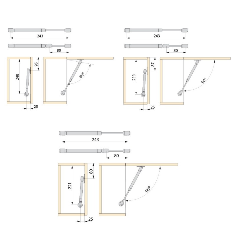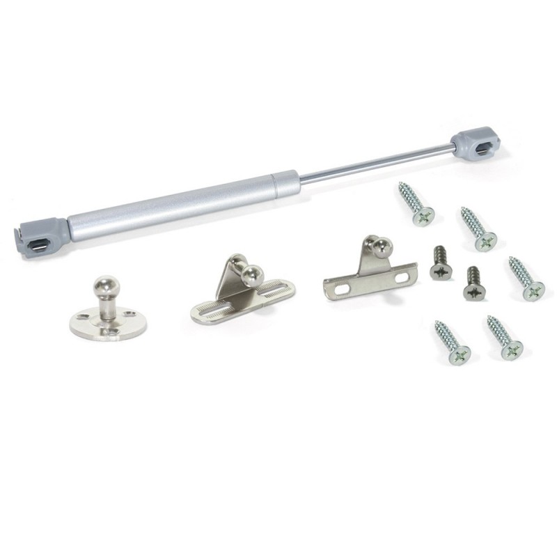 Pistones para muebles que permiten la apertura de las puertas de madera o con marco de aluminio. Proporcionan una subida amortiguada de la puerta elevable en muebles de cocina, hogar y baño. Dichos pistones amortiguadores se suministran embolsados individualmente con las instrucciones de montaje. Cada bolsa contiene un pistón, un enganche para costado, un enganche para puerta de madera, un enganche para puerta con marco de aluminio y los tornillos necesarios.