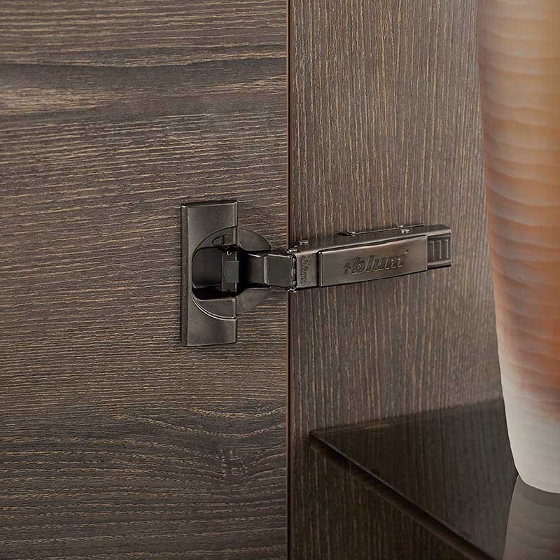 La gama de bisagras CLIP top y CLIP top BLUMOTION de Blum en acabado negro ónix se integra de manera sencilla con los muebles oscuros aportando un toque sutil de elegancia.