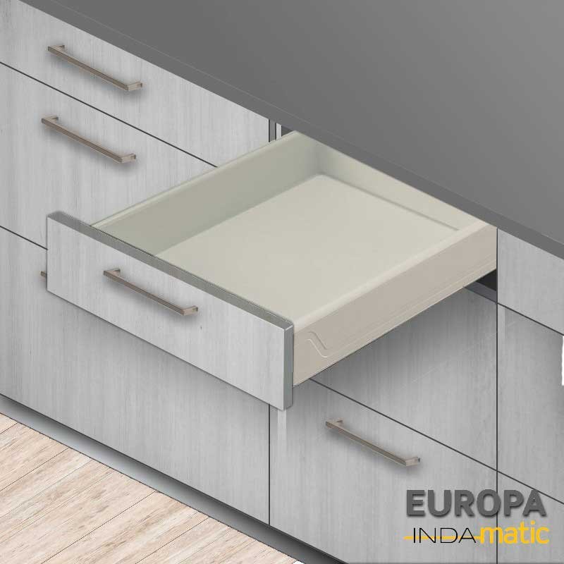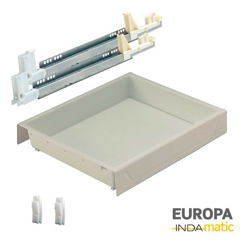 Ampliar Cajón de cocina Indaux Europa fabricado en PVC inyectado de color blanco (RAL 9001) con guías para un fondo estándar de 50 cm y extracción parcial.