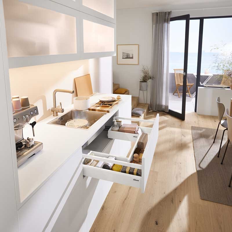 Ampliar Cajón de cocina Blum para mueble bajo fregadero, diseñado para una carga de hasta 30 kg de peso. Disponible en blanco o gris.
