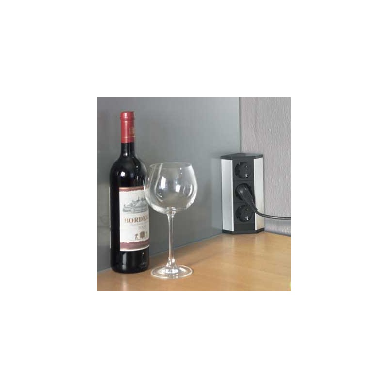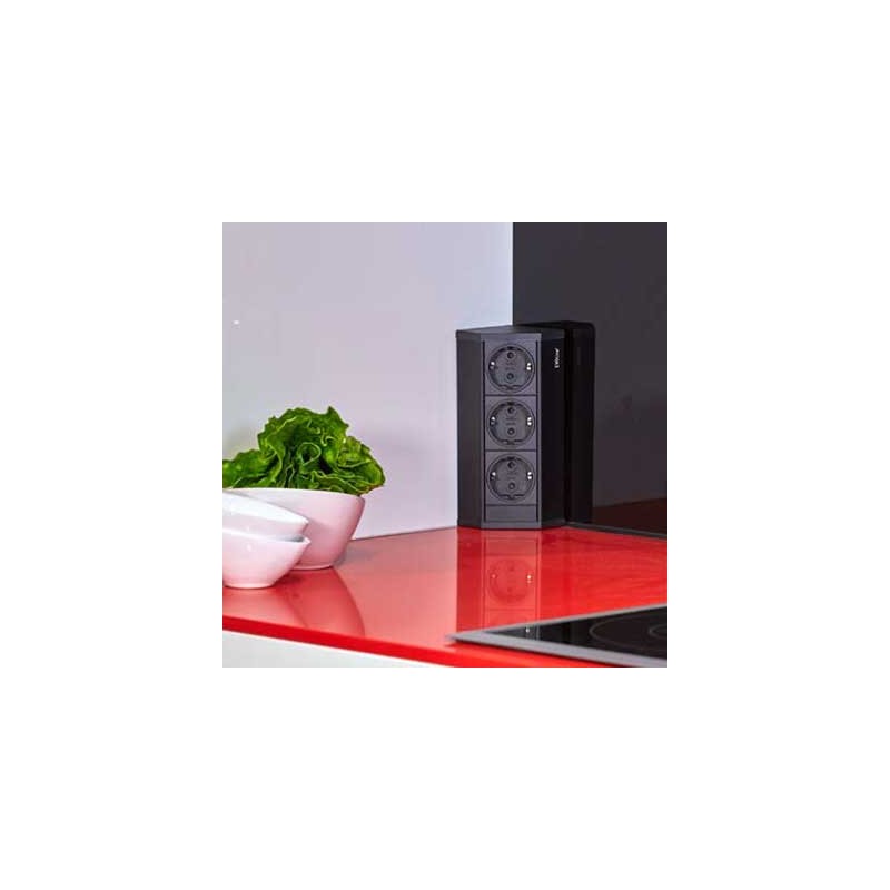 Puede ser fijado en un ángulo de 90º, aprovechando una esquina, o colocado debajo de los muebles altos de la cocina o baño. También se usa mucho para los interiores de los muebles persianas para conectar la cafetera, batidora u otros utensilios.