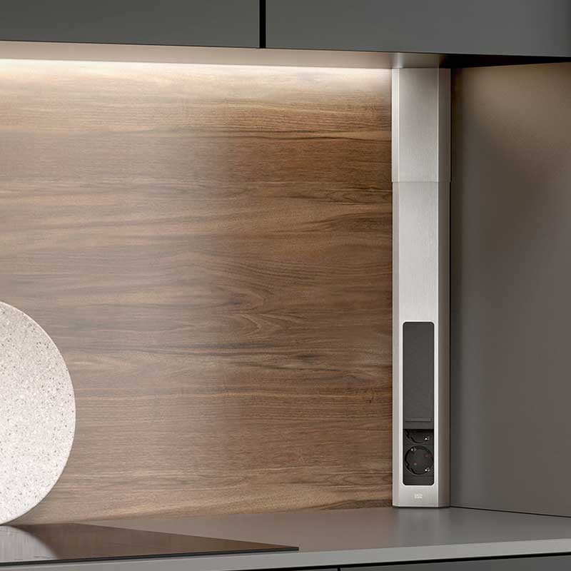 La regleta CASIA 2 versión larga se caracteriza por el elemento telescópico de longitud ajustable, apropiado para su instalación en distintos tipos de cocina, con o sin armarios. El mecanismo deslizante permite ocultar los enchufes. Además al igual que la versión corta del Casia 2, también puede instalarse en posición vertical u horizontal.