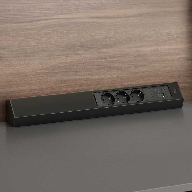 CASIA 2 es una regleta de caja de enchufes de diseño estilizado para rincones con superficie metálica de alta calidad.