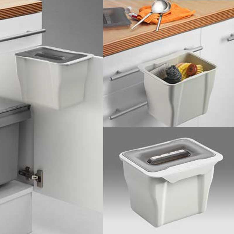Contiene una pestaña para fijarlo tanto a una puerta (exterior o interiormente) como a un tirador de cocina o baño. El Kitchen Box es muy práctico y versátil. Cubo adicional Kitchen Box de 5 Litros, disponible en 3 acabados: gris, blanco y antracita.
