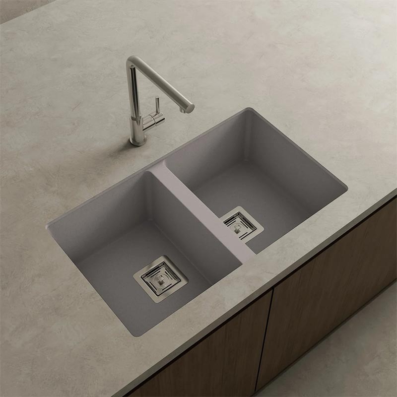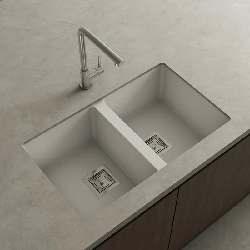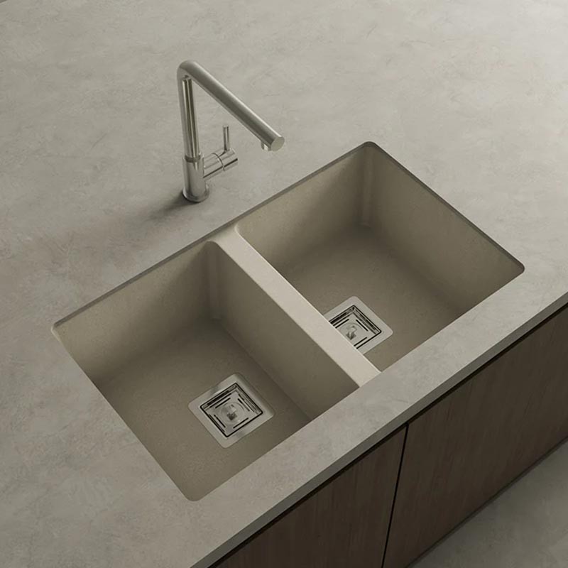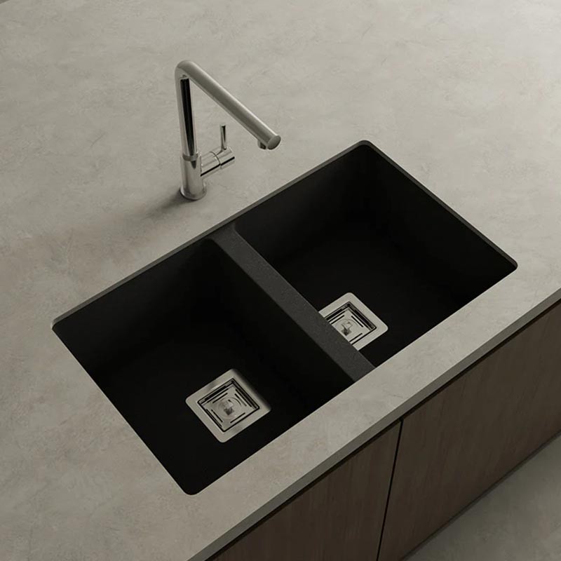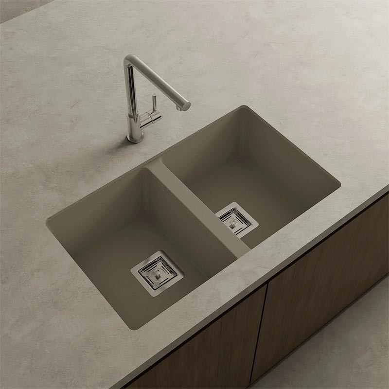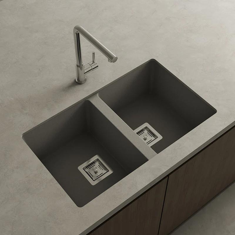 Ampliar Fregadero de granito Hekla® modelo Zie 70 de dos cubetas acabado mate para montaje bajo encimera o sobre encimera en muebles de 80 cm mínimo.