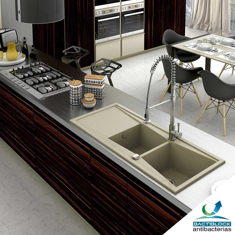 Además todos los fregaderos sintéticos de Poalgi llevan un agente antibacterias, un aditivo antimicrobiano idóneo para una amplia variedad de materiales poliméricos. La tecnología patentada por NBM está basada en arcilla funcionalizada con plata, comportándose como una fuente natural altamente eficaz como agente antimicrobiano. Este aditivo inhibe el crecimiento de bacterias hongos y levaduras, siendo por tanto una herramienta muy eficaz frente a olores y manchas.