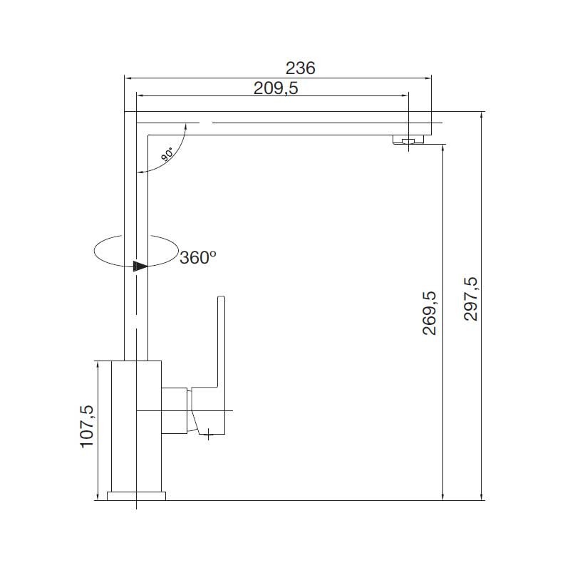Grifo monomando modelo Maya Escuadra de 29,7 cm de altura, rotación 360º y acabado cromado para fregadero de cocina. Cartucho cerámico de 25 mm. Instalación vertical sobre repisa.
