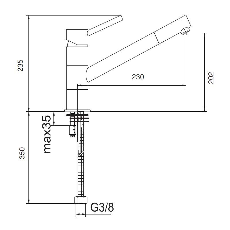 Grifo monomando de caño bajo modelo Iris de 23,5 cm de altura y acabado cromado para fregadero de cocina. Cartucho cerámico de 35 mm. Instalación vertical sobre repisa.