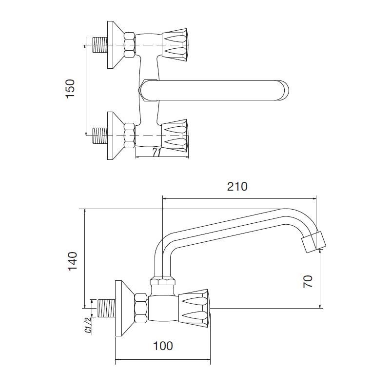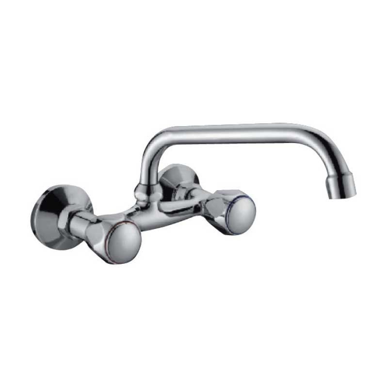 Grifo bimando con montura cerámica modelo Aida acabado cromado para fregadero de cocina. Diseño tipo mural para instalación a pared. Distancia entre tomas: 15 cm.
