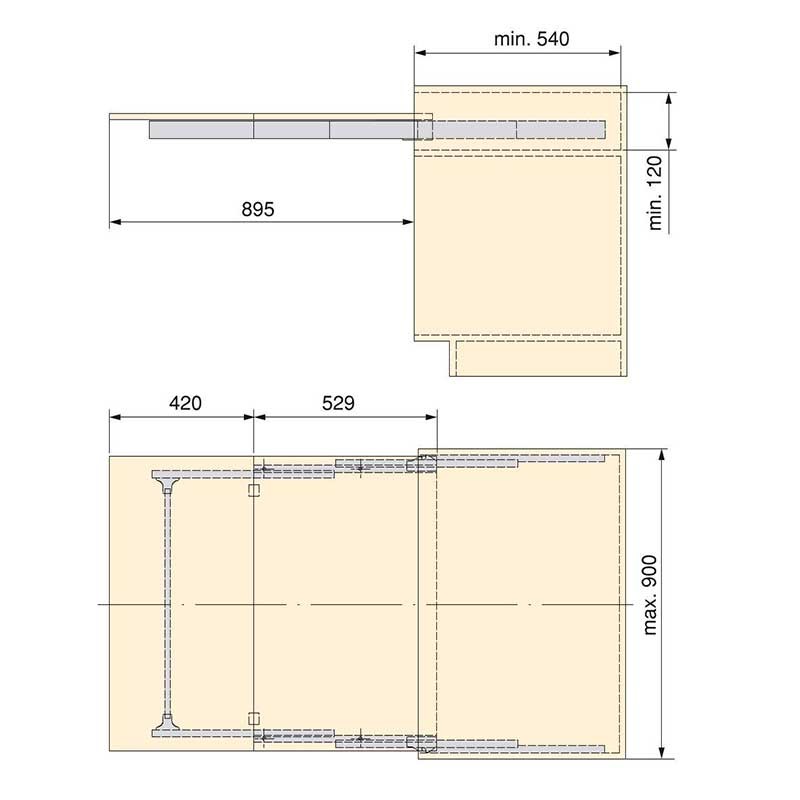La mesa Lunch puede instalarse en módulos de anchura máxima de 900 mm y una profundidad mínima de 540 mm. Las guías del sistema permiten la extracción de una superficie de 895 mm y una capacidad de carga de 60 kg. La mesa se obtiene mediante 2 tableros que se despliegan con la ayuda de unas bisagras, quedando alojados en el mismo compartimento del sistema una vez se finalice su uso. Además, disponen de un mecanismo de bloqueo de seguridad para evitar el cierre involuntario de la mesa. Para montajes en módulos de anchura mayor de 900 y hasta 1200 mm se dispone de un perfil estabilizador código 2045269. No se incluyen los tableros que conforman la superficie de apoyo.