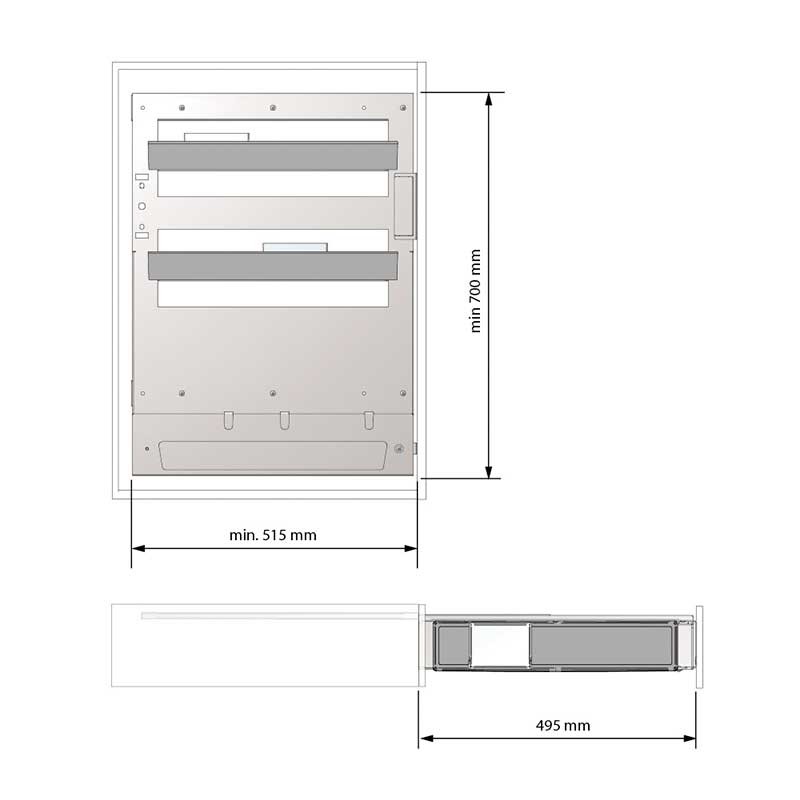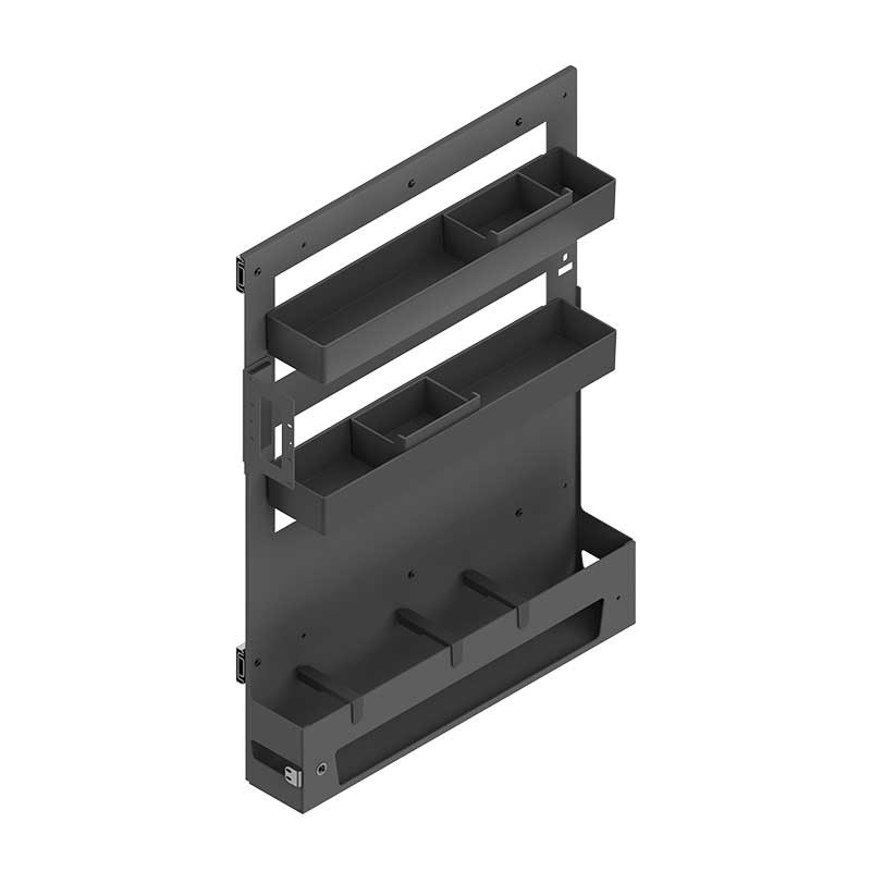Módulo extraíble para mueble de cocina construido en acero con guías laterales reversibles, botellero inferior, estantes y bandejas de ABS removibles.