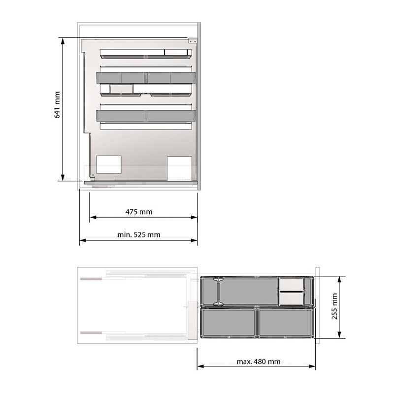Módulo despensero para mueble de cocina construido en acero con sujeción basal reversible para unir a la base de un cajón. Incluye 4 bandejas de ABS portables y varios accesorios de organización.