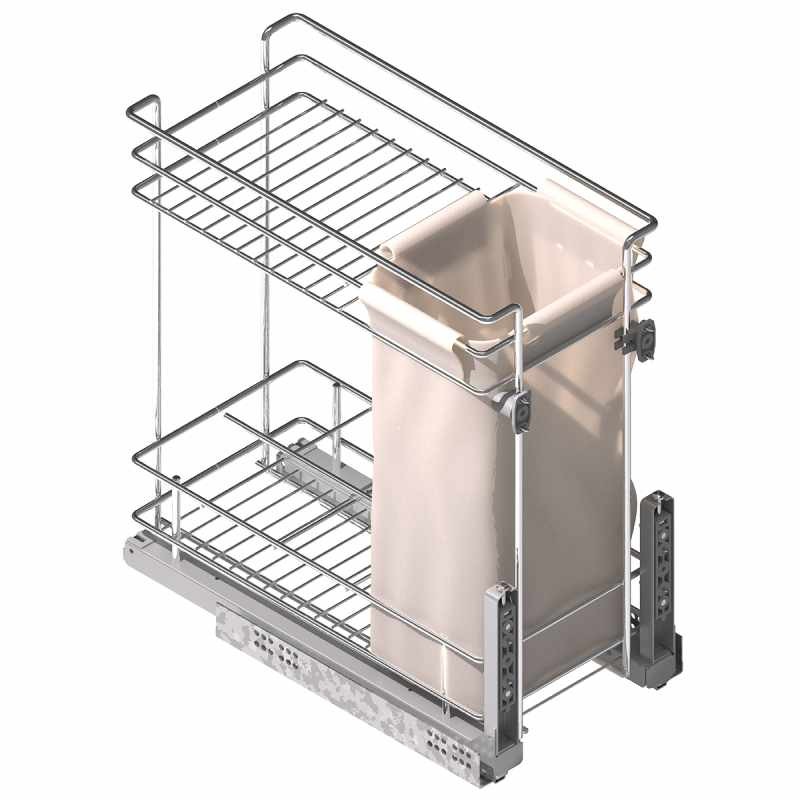Módulo extraíble para mueble de cocina para almacenaje de botellas, botes u otros productos. Además lleva incorporada una bolsa de tela para guardar el pan.