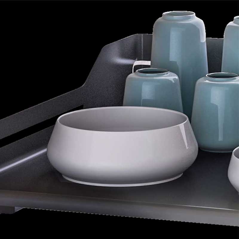 Los estantes pueden retirarse fácilmente para su limpieza y están diseñados con el borde cerrado, para evitar que se vuelquen las botellas y que pequeños utensilios se puedan caer. Movimiento suave y silencioso.
