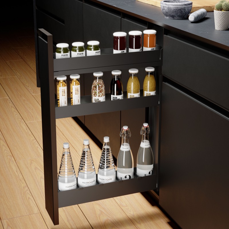 Módulo extraíble para muebles de cocina, ideal para organizar botellas, botes, especias y pequeños recipientes con total comodidad.