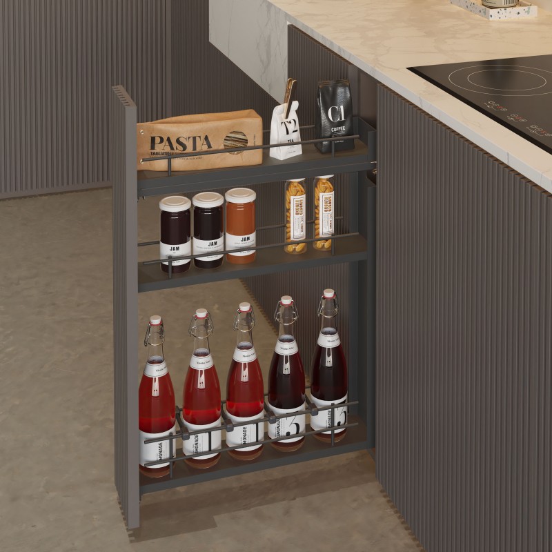 Ampliar Botellero extraíble Compact color antracita de 3 alturas con bases de melamina, guías ocultas, cierre amortiguado y carga de 30 kg.