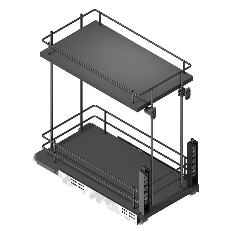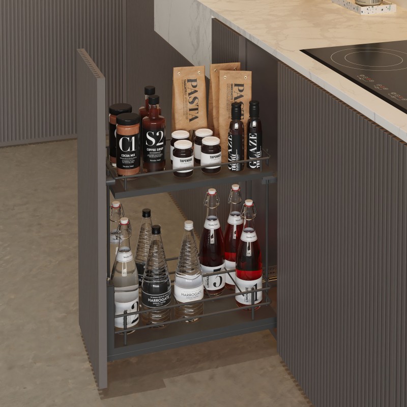 Módulo botellero extraíble Compact en acabado antracita para muebles de cocina, ideal para organizar botellas, botes, especias y pequeños recipientes de forma práctica y accesible.