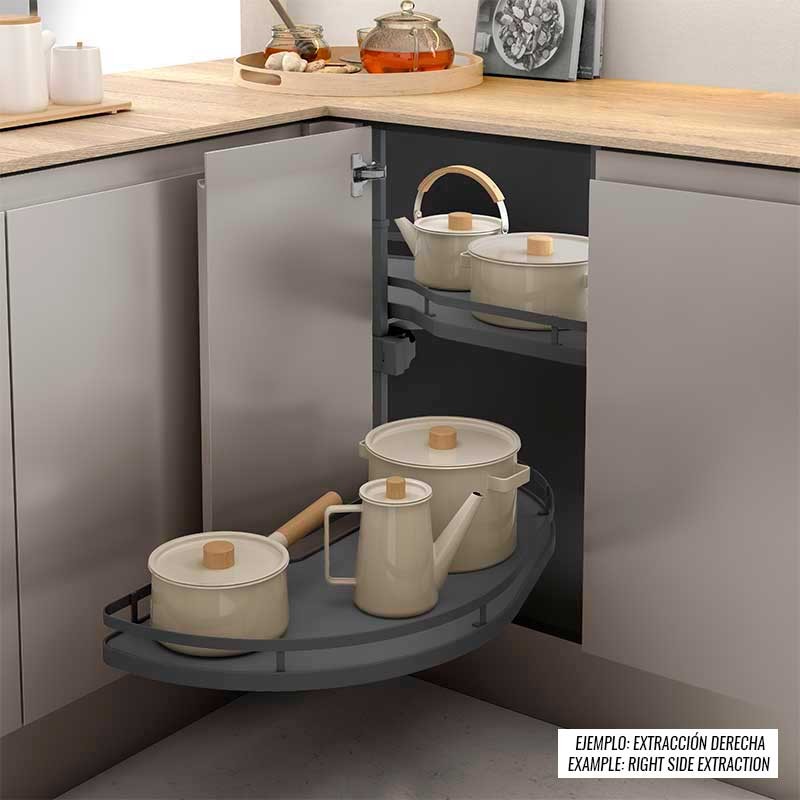 Módulo extraíble para mueble rinconera de cocina. Doble altura de bandejas para un mejor aprovechamiento del espacio. Cada bandeja sale independientemente.