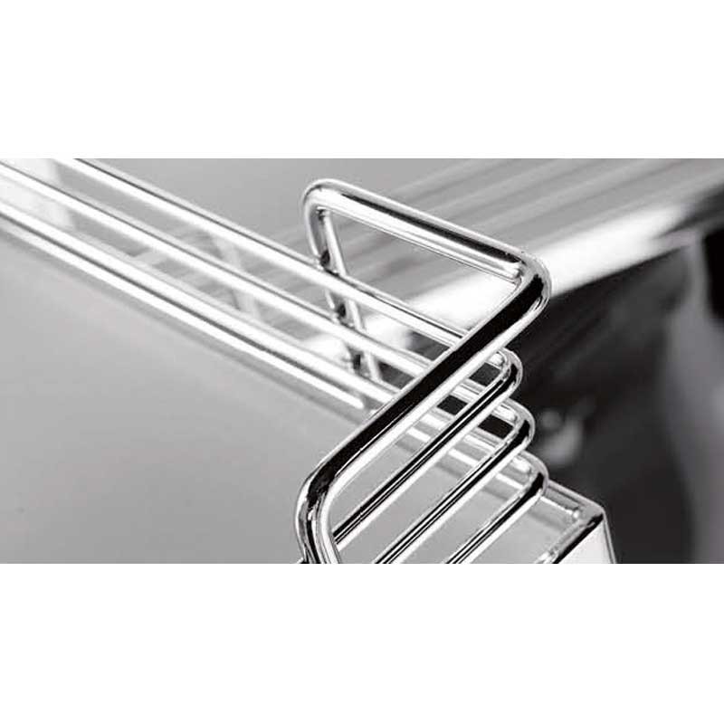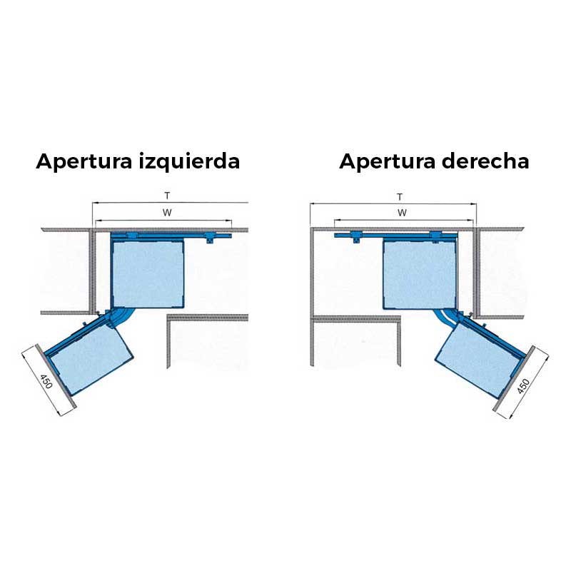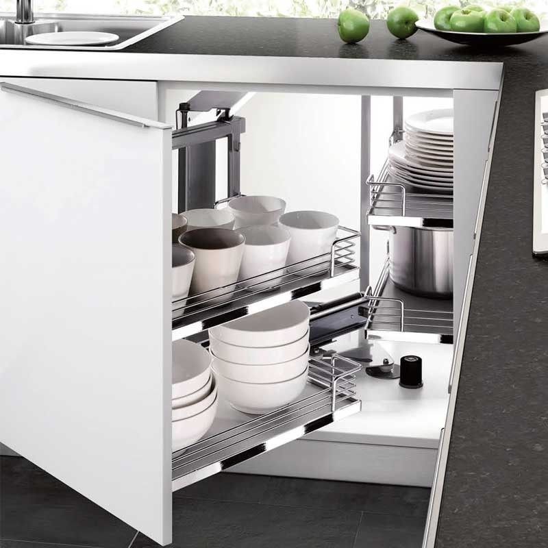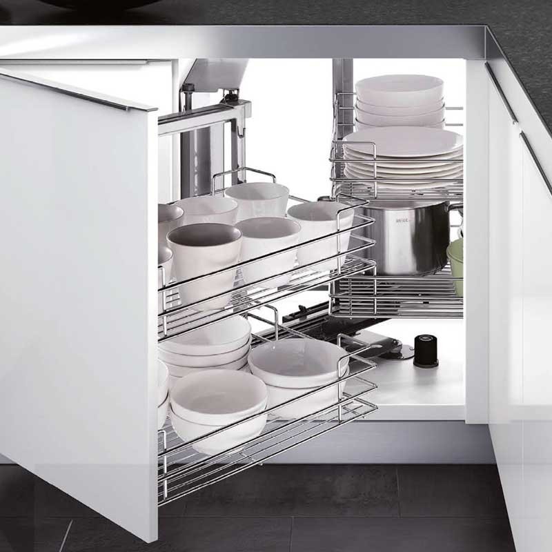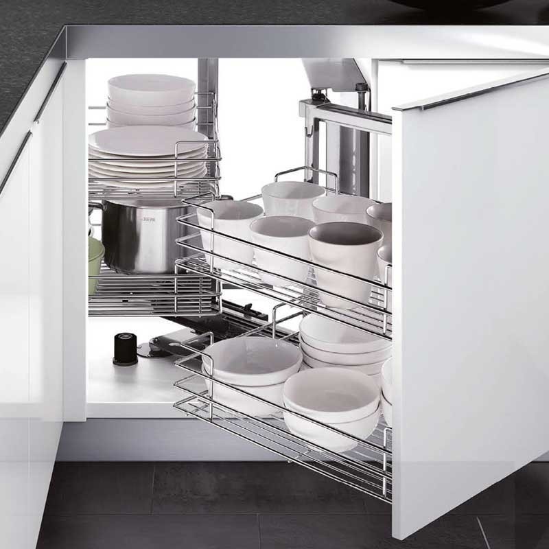 Ampliar Módulo extraible frontal de 4 bandejas Magic Corner para mueble rincón ciego de cocina de 900 mm de ancho mínimo y puerta de 450 mm. Bandejas con base de madera gris. Apertura puerta a elegir.