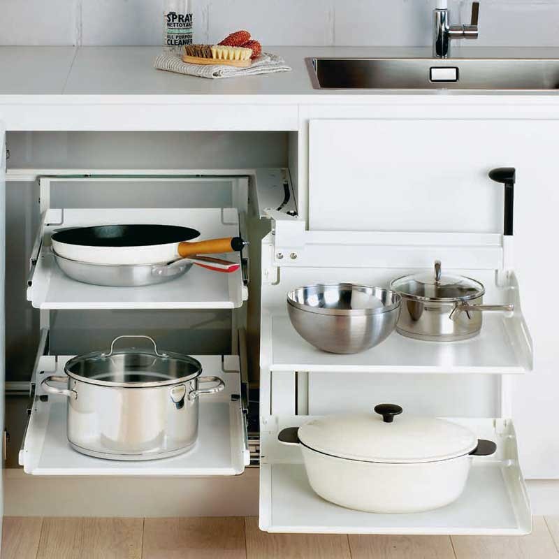 Los estantes traseros también son extraíbles individualmente para un cómodo acceso. Ideal para guardar baterías de cocina y vajilla.