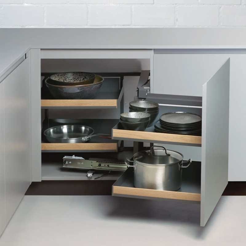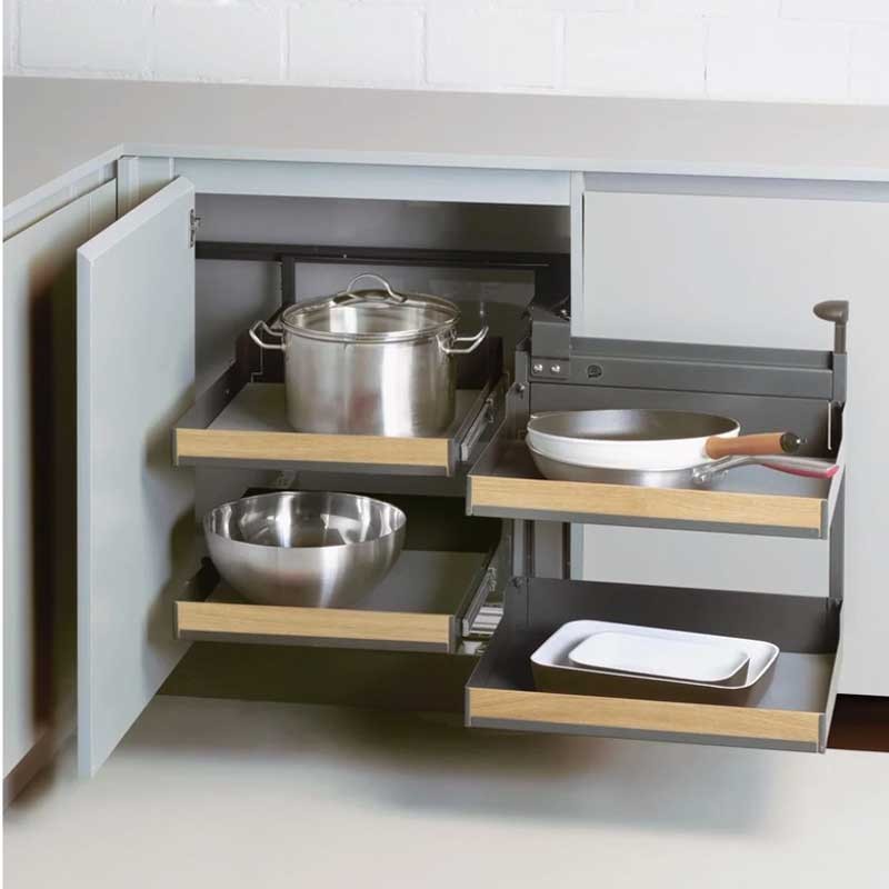 El funcionamiento es sencillo: abrir la puerta, tirar del asa y los estantes delanteros giran saliendo completamente del mueble.