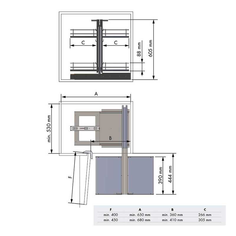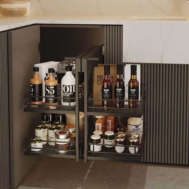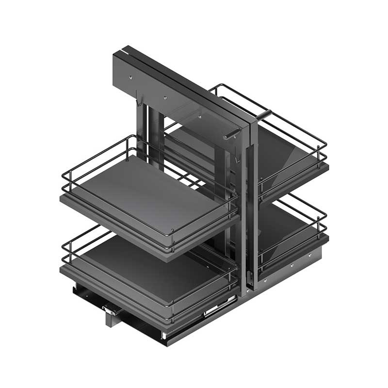 Módulo bastidor extraíble articulado para mueble rinconera de cocina. Doble cuerpo y doble altura de bandejas para una mayor capacidad y aprovechamiento del espacio.