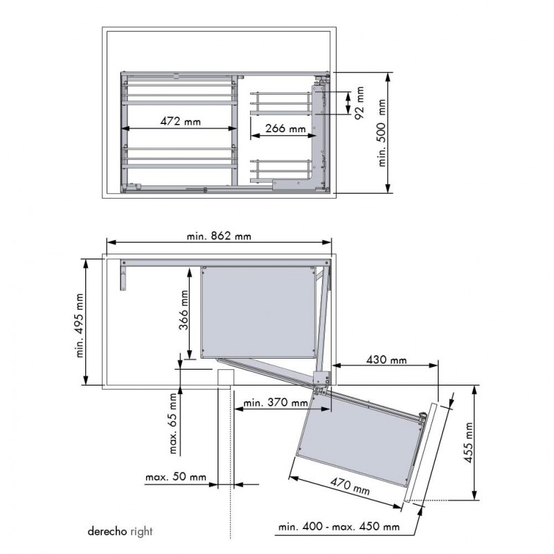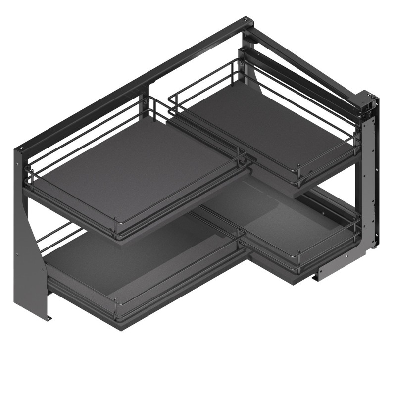 Módulo kit extraíble articulado de la gama Compact en acero color antracita, diseñado para muebles rinconeros de cocina. Incorpora doble cuerpo y doble altura de bandejas que optimizan la capacidad de almacenaje y el aprovechamiento del espacio interior.