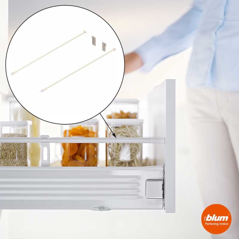 Ampliar Juego de guardacuerpos longitudinales con adaptadores para la trasera de caceroleros Blum Metabox altura M (86 mm) de fondo 50 cm en color blanco crema.