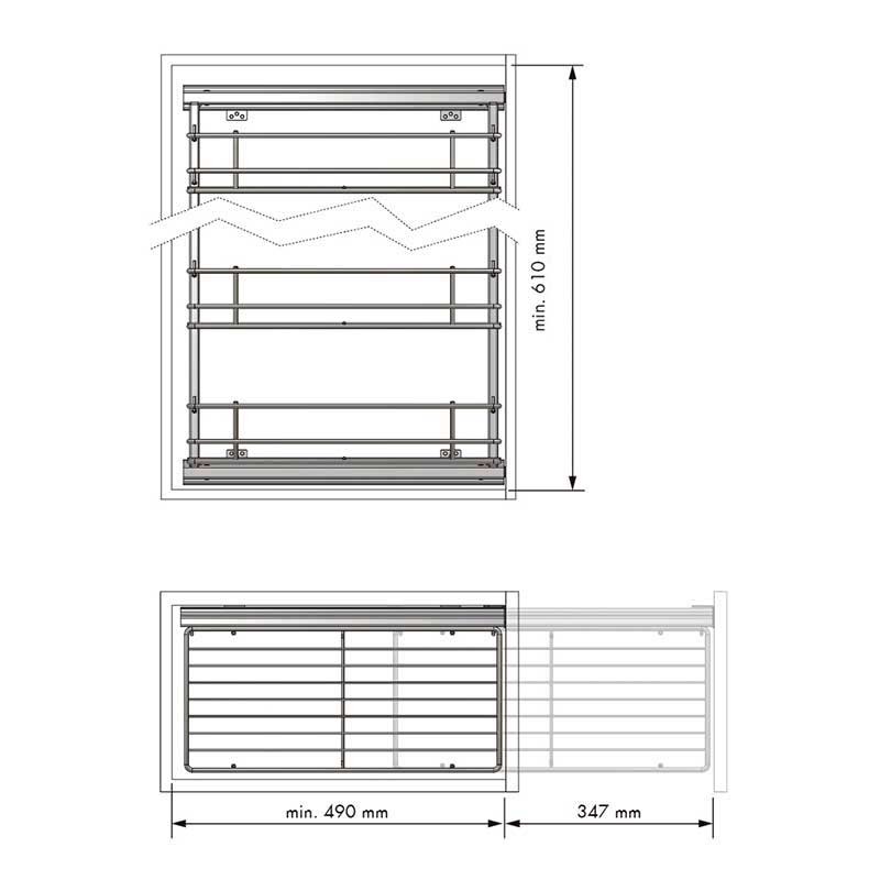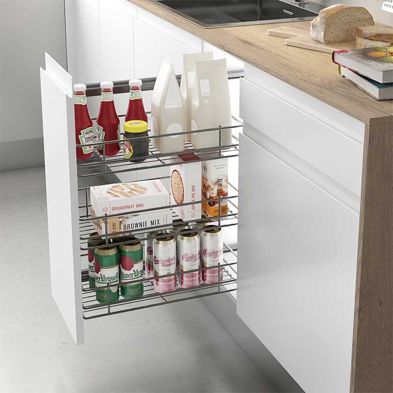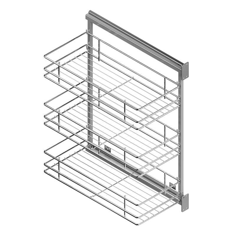 Ampliar Bastidor extraible de acero cromado con 3 cestas, guías laterales de extracción parcial y anclaje a la puerta del mueble.