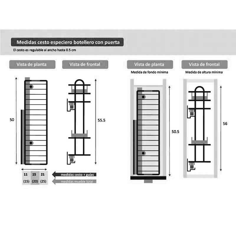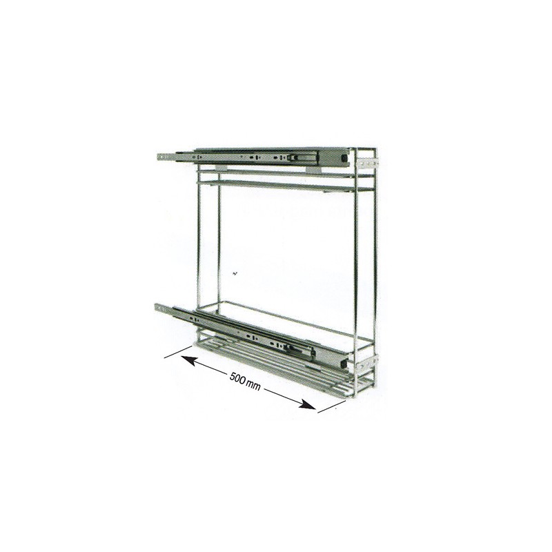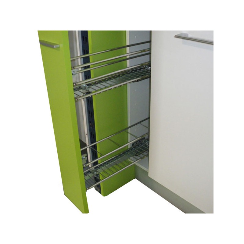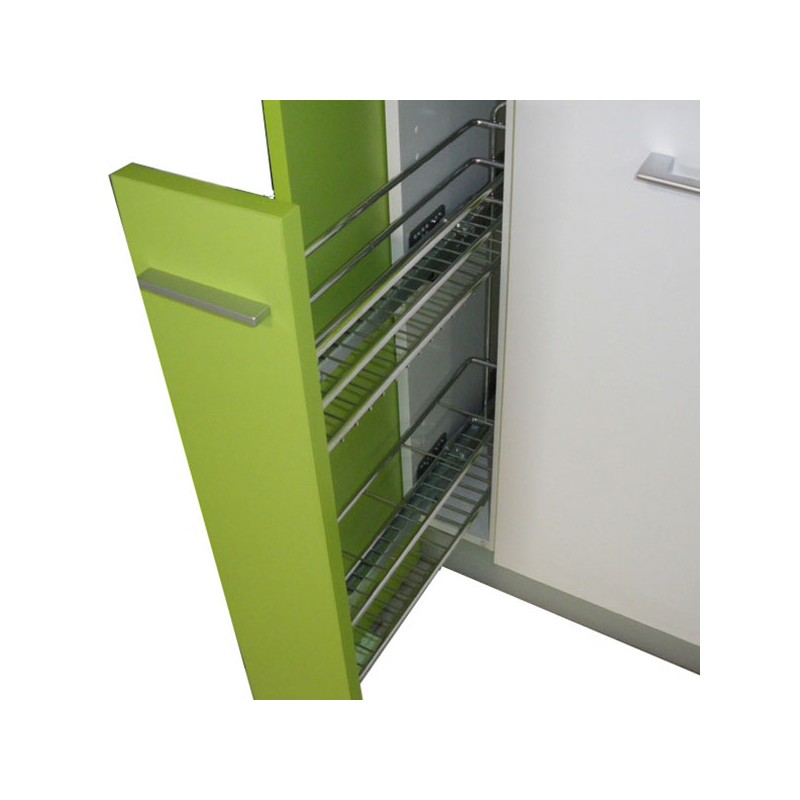 Botellero-especiero extraíble reversible en acero cromado con guías de extracción total y freno para una deslizamiento suave del herraje.
