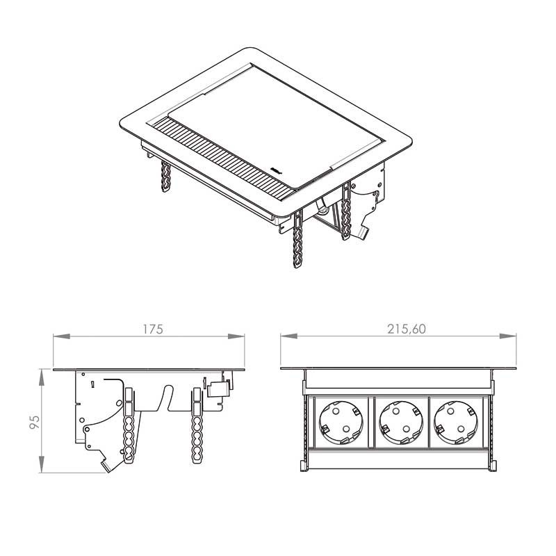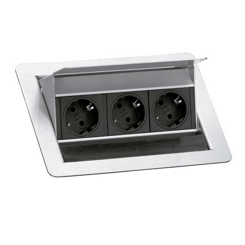 Ampliar Regleta de enchufes para encimera de cocina modelo Flip Top con 3 tomas de red Schuko acabada en acero inox. Dimensiones: 215,6 x 175 x 95 mm.