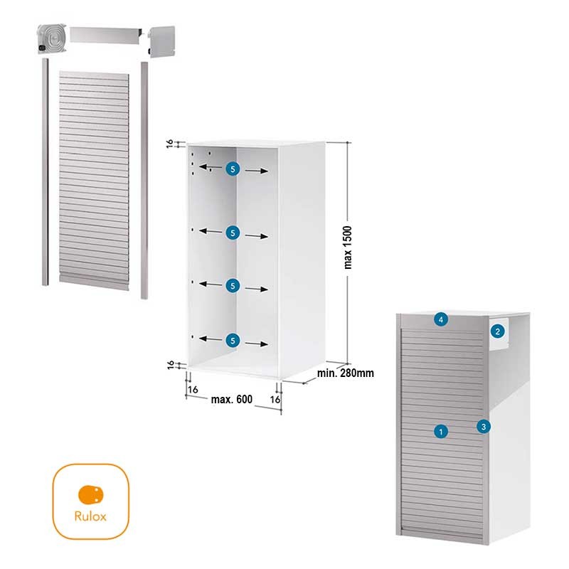 El montaje del kit es sencillo y rápido de instalar sobre el frontal del mueble al no necesitar de ningún mecanizado especial más allá de los agujeros para anclar el mecanismo de enrollado y los perfiles laterales. Además en caso de necesitar adaptar la persiana a una medida en concreto, resultará fácil de realizar mediante el corte de las lamas y la cornisa para ajustar el ancho, o los dos perfiles laterales en el supuesto de ajustar también la altura.